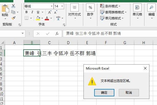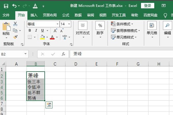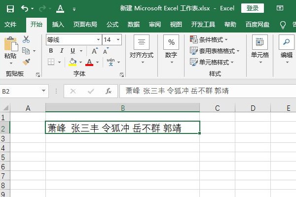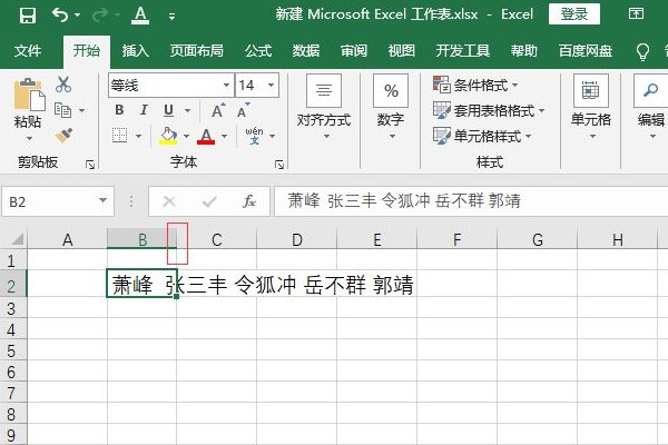 2、調(diào)整B列列寬,輸入人名,下面我們把B2單元格內(nèi)的數(shù)據(jù)拆分成多行。