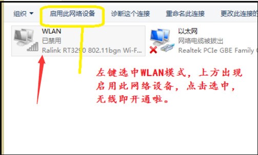 2、進去后看到WLAN是灰色禁用狀態,這就是Win8系統里關掉的WiFi。右鍵點它,選啟用,WiFi就打開了。