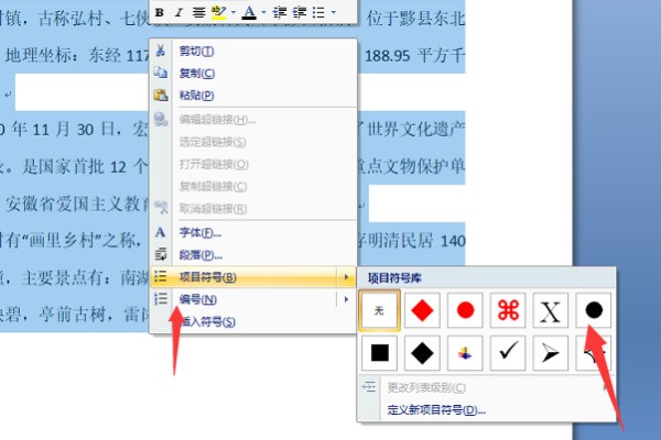 WORD文檔段落前面的那個小黑點(diǎn)是通過設(shè)置項目符號實現(xiàn)的。選中需要設(shè)置的段落,點(diǎn)擊右鍵。選擇項目符號并點(diǎn)擊圓點(diǎn)即可實現(xiàn)。具體的以WIN10操作系統(tǒng)的WORD2007為例,設(shè)置方法如下: