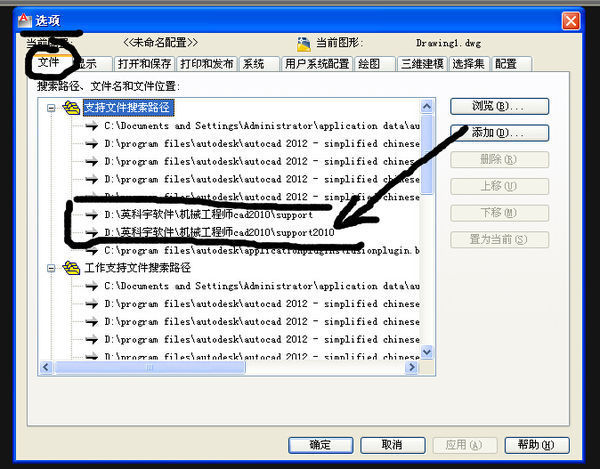 3、啟動CAD2010(或2012也可以),然后繪圖區右鍵--選項--文件--支持文件搜索路徑,添加機械工程師的幾個路徑。如下圖