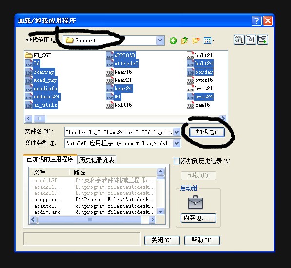 B、機械工程師CAD2010Support下面的所有:“.LISP”文件及所有包含“24(如YKYMToolsReactor24)”。見下圖:
