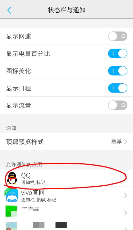 3、在“狀態(tài)欄與通知”里面,選擇要設(shè)置讓消息通知顯示在鎖屏上的應(yīng)用,如圖選擇QQ進入。