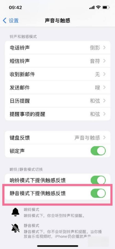 在“聲音與觸感”頁面中,找到“靜音模式振動”開關。將該開關向右滑動至綠色狀態,即表示已啟用靜音振動模式。啟用后,手機在靜音狀態下(如通過側邊靜音開關關閉鈴聲)仍會通過振動提醒來電、消息或通知,避免因完全靜音而錯過重要信息。
