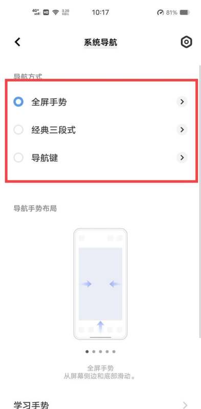 選擇導航方式:在系統導航設置頁面中,可以看到多種導航方式。為了設置導航手勢,需要勾選【全屏手勢】選項。此外,也可以選擇【經典三段式】作為另一種導航方式,但這不是手勢導航,而是傳統的三鍵導航。