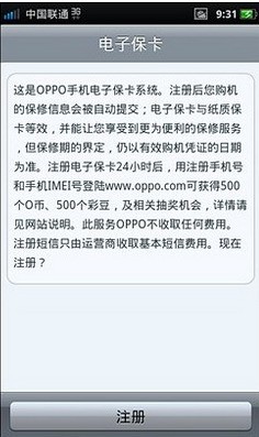 首先,可以找到oppo手機上注冊電子保卡的內(nèi)置程序,然后點擊注冊,會發(fā)送一條注冊短信(費用為正常短信費)。