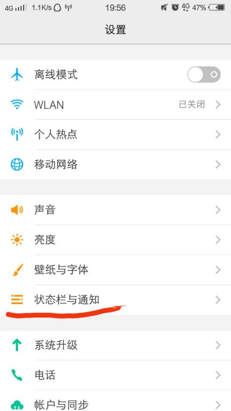 打開手機設置,找到狀態欄與通知,然后打開它