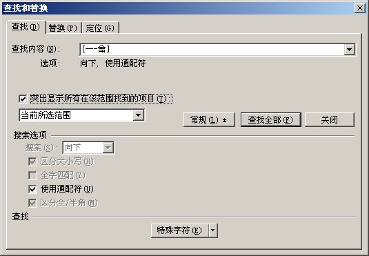 接下來,選中這些帶拼音的文字,按下Shift+F9切換到域代碼模式,并保持選中狀國操礎(chǔ)川曾生結(jié)跑等年態(tài),按下Ctrl+F鍵彈出【查找和替換】面板,在【查找內(nèi)容】右側(cè)的輸入框中輸入“[一-龠]”,勾選“突出顯示所有在該范圍找到的項目”,并在其下方下拉列表中選方擇“當前所選范圍”,然后單擊【高級】按鈕,勾選“使用通配符”(如圖3所示),點擊【查找全部】按鈕,即可選中域代碼中的全部漢字。
