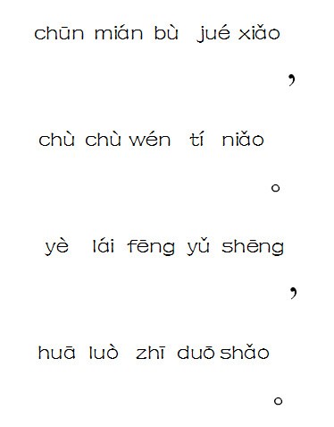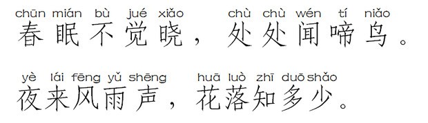 將這些漢字的顏色設(shè)置為“白色”后選中所有代碼,再次按下快捷鍵“Shift+F9”,切換到正常顯示模式,此時,《春曉》詩中的所有漢字都已經(jīng)隱身了,而其上方的標注拼音則完好無損。接下來,在每一詩句后面敲擊回車鍵,即可得到最終效果(圖4)。