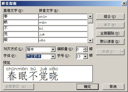 我們看到,每個【基準文字】右側(cè)的【拼音文字】中,都自動生成了對應(yīng)的拼音,360問答在左下側(cè)的【字體】列表中選擇“方正舒體”或“華文細黑”,這兩種字體都比較適合做拼音字體,而其他字體則大多不能正確顯示a和g這兩個字母。如果覺得拼音字號不合適,也可以在【字號】中進行手動調(diào)整。調(diào)整完成后點擊【確定】按鈕退出。此時的效果如圖2所示。