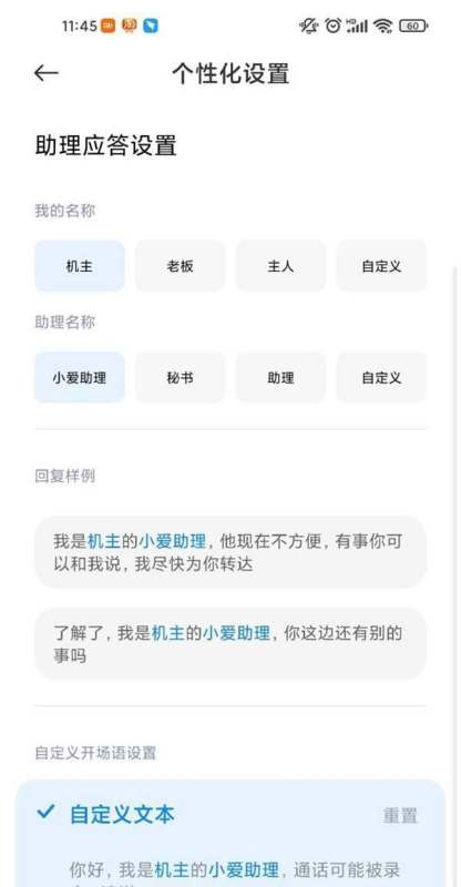 助理名稱:將默認名稱更改為自定義名稱(如“我的智能助手”),增強個性化體驗。