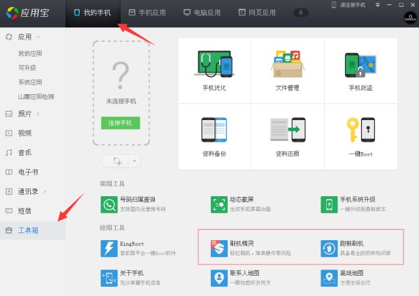 你可以先裝個騰訊手機管家,通過該軟件正常連接電腦后通過工具箱內的刷機工具即可完成刷機管理。