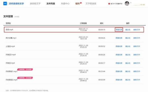 第4步:轉寫完成后,在文件列表里可以看到轉寫后的文件,點擊“查看結果”可以看到詳細的文字內容;