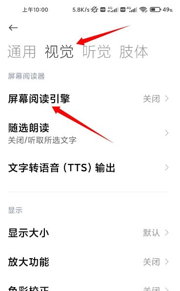 3、選中視覺選項(xiàng),點(diǎn)擊屏幕閱讀引擎的選項(xiàng)。