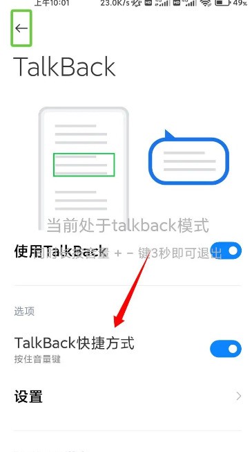 4、點(diǎn)擊talkback的選項(xiàng),將talkback快捷方式后面的開關(guān)打開,長(zhǎng)按音量加和音量減三秒鐘即可暫時(shí)關(guān)閉talkback并且解鎖屏幕。