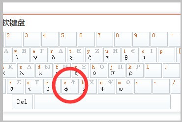 3、即可在打開的希臘字母軟鍵盤中點(diǎn)擊“V”字母對(duì)360問(wèn)答應(yīng)的位置,即可插入一個(gè)圓圈中間一豎的符號(hào)。