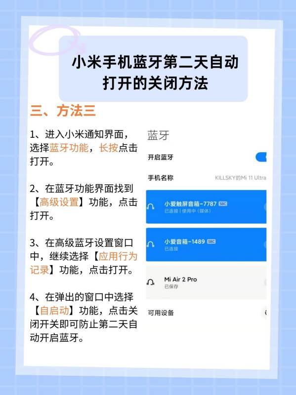 進入小米通知界面,選擇藍牙功能,長按點擊打開。在藍牙功能界面找到【高級設置】功能。在高級藍牙設置窗口中,繼續選擇【應用行為記錄】功能。在彈出的窗口中選擇【自啟動】功能,點擊關閉開關即可防止第二天自動開啟藍牙。