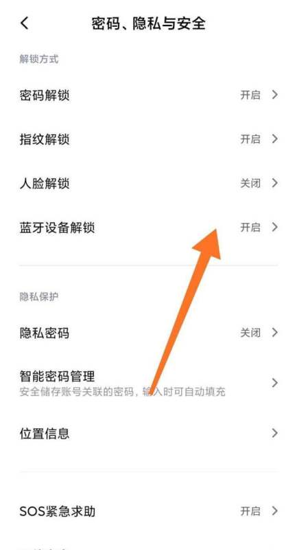找到藍(lán)牙設(shè)備解鎖:在“密碼、隱私與安全”頁(yè)面中,繼續(xù)滑動(dòng)查找“藍(lán)牙設(shè)備解鎖”功能入口。