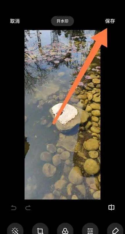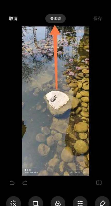 關閉水印選項在編輯頁面的上方功能欄中,找到并點擊【關水印】選項(部分機型可能顯示為“水印”開關)。系統會自動移除照片中的水印。