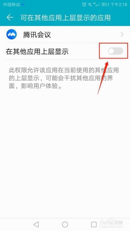 在“可在其他應(yīng)用上層顯示的應(yīng)用”界面,點(diǎn)擊“在其他應(yīng)用上層顯示”右側(cè)的開關(guān)按鈕。