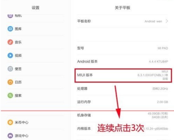 2、連續3次地點擊“MIUI版本”選項,直到平板提示,“您現在處于開發者模式”。