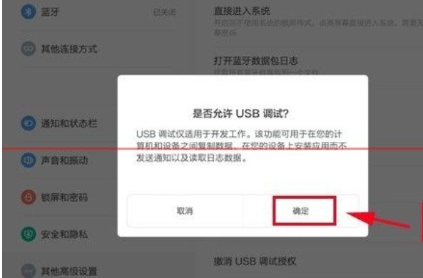 4、找到USB調試,點擊右邊的開關按鈕,將其打開,彈出窗口提示,選擇確定,USB調試就打開了。