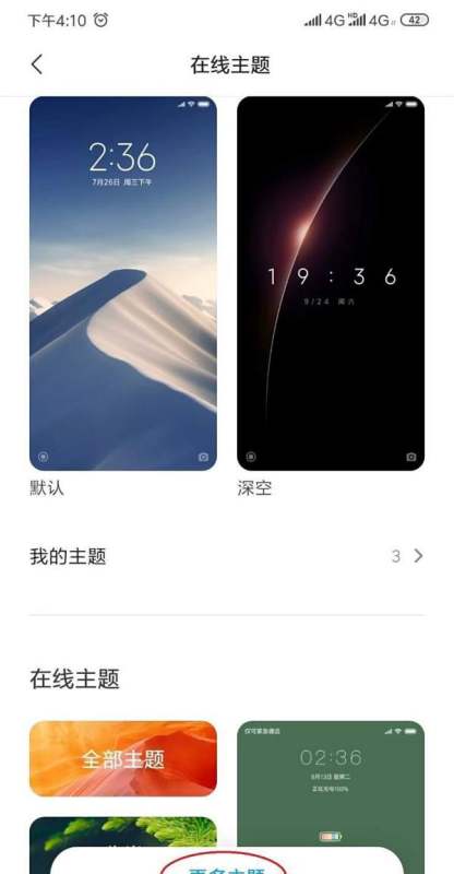 瀏覽主題庫:進入主題設置頁面后,下拉界面并點擊“更多主題”選項。