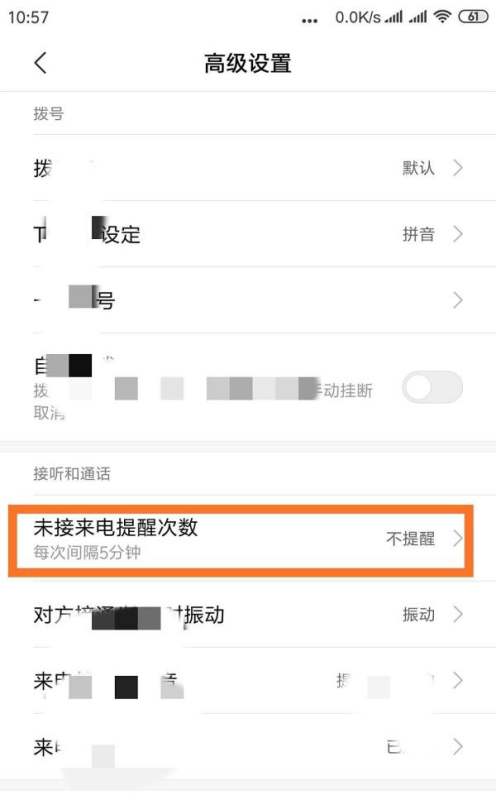 設置未接來電提醒次數:在高級設置頁面中找到未接來電提醒次數選項(通常帶有紅框標注),點擊進入設置界面。