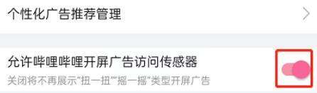 第三步:關閉傳感器權限在隱私權限設置頁面中,找到【允許嗶哩嗶哩開屏廣告訪問傳感器】選項,將其右側開關滑動至關閉狀態(灰色表示關閉)。關閉后,APP將無法通過傳感器檢測設備動作,從而停止“扭一扭”互動廣告的觸發。