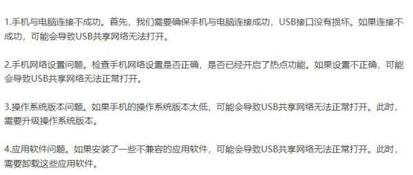 手機使用USB共享網絡功能可能無法正常工作的原因有多種可能性,以下是一些常見原因和解決方法: