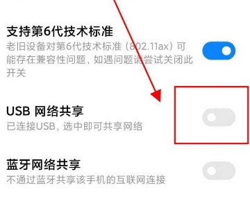 3、接著在打開的頁面中,打開“USB網(wǎng)絡(luò)共享”右側(cè)的開關(guān)。