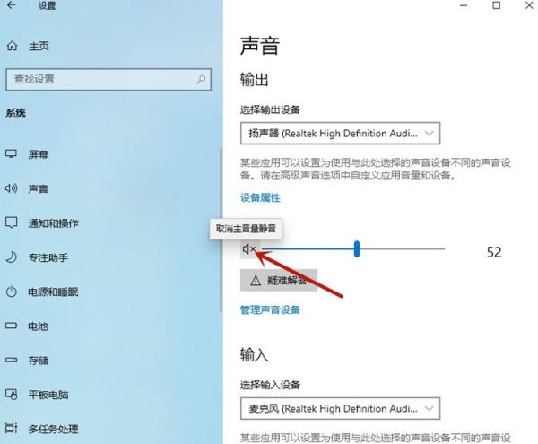 第四步:點擊【聲音】,再點擊圖標【取消主音量靜音】,完成操作