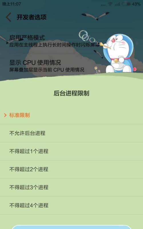 設置后臺進程限制在開發者選項中,向下滑動找到“后臺進程限制”選項。點擊后可選擇限制數量(如“不得超過2個進程”“不得超過3個進程”等),或選擇“標準限制”(系統默認策略)。