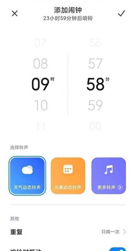 步驟三:設(shè)置鬧鐘參數(shù)調(diào)整時(shí)間、重復(fù)周期、鈴聲等選項(xiàng)后,點(diǎn)擊右上角【√】圖標(biāo)完成設(shè)置。
