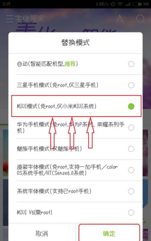 安裝并配置字體管家應用通過應用商店下載“字體管家”應用(或其他同類工具),安裝完成后打開應用。在字體管家首頁左側的隱藏欄中,找到“字體替換模式”選項,點擊進入后選擇“MIUI模式(免ROOT)”,此模式可繞過ROOT權限實現字體替換。