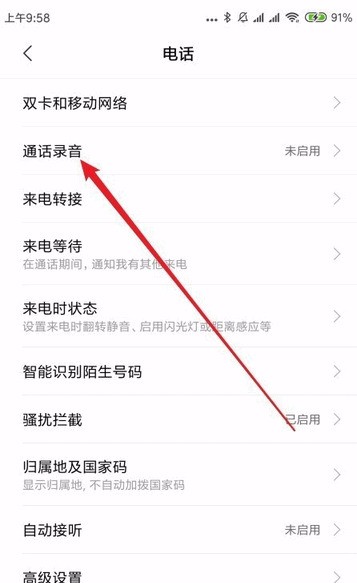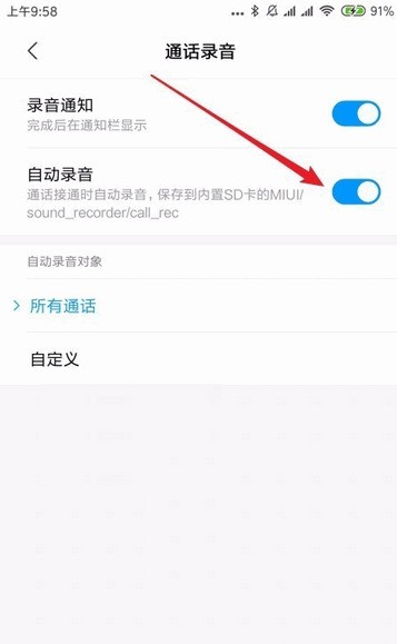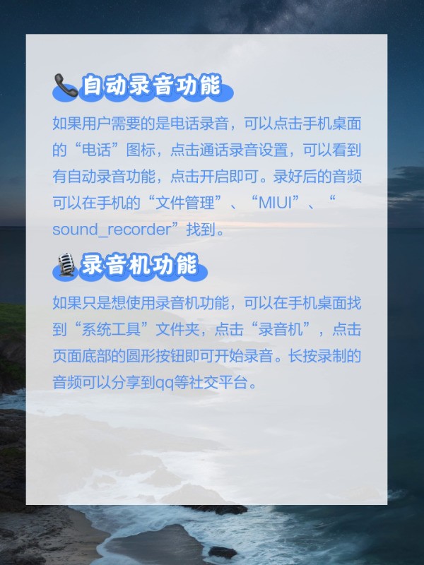 如果用戶需要的是電話錄音,可以點擊手機桌面的“電話”圖標,點擊通話錄音設置,可以看到有自動錄音功能,點擊開啟即可。錄好后的音頻可以在手機的“文件管理”、“MIUI”、“sound_recorder”找到。