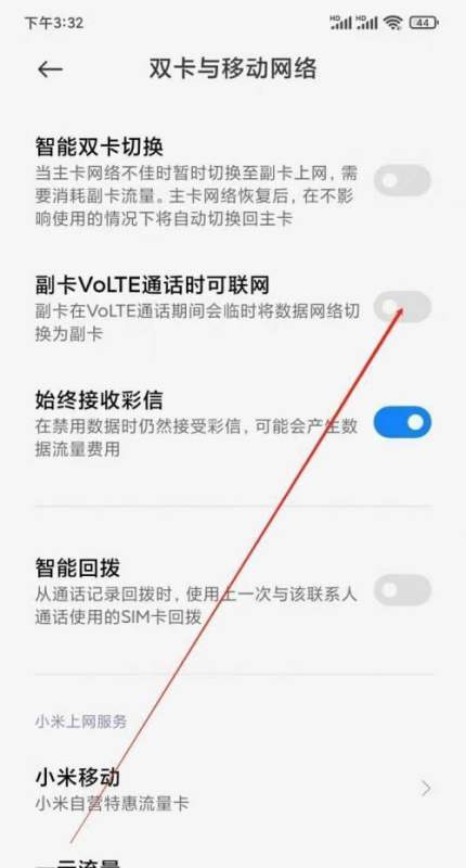 開啟副卡VoLTE通話聯網功能:在雙卡與移動網絡界面中,找到【副卡VoLTE通話時可聯網】選項,點擊右側開關將其開啟(開關變為藍色或綠色表示已啟用)。