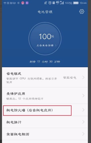 3、進入電池管理后,選擇“耗電防火墻(后臺耗電應用)”。