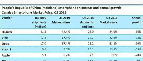 華為:市場份額:42.4%,出貨量4150萬臺,同比增長66%,是排行榜中唯一增長的手機品牌。