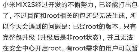 小米MIX2S更新情況更新狀態:小米MIX2S在MIUI11 20.3.19更新中成功打包,未停更。更新建議:由于更新后無法開啟Root,建議用戶可停留當前版本,等待下周更新以避免可能的問題。