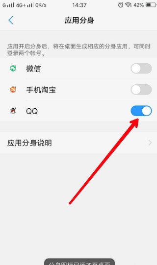 3、接著在應用分身頁面中,把QQ對應的按鈕打開。