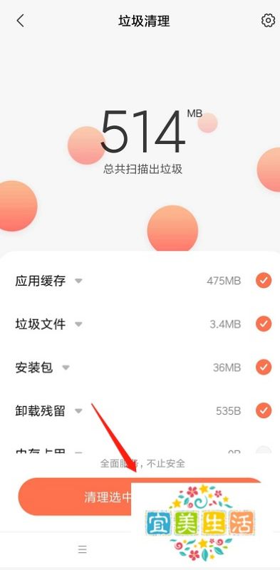 選擇并清理垃圾掃描完成后,界面會顯示可清理的垃圾類型及占用空間大小。用戶可手動勾選需要清理的項目(如應用緩存、廣告垃圾等),或直接點擊一鍵清理按鈕完成操作。