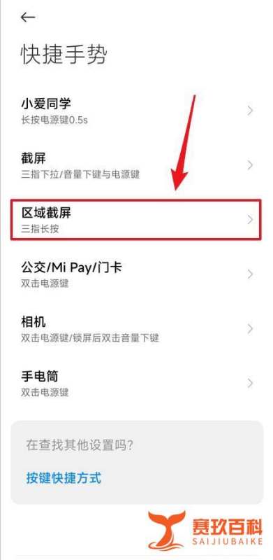 進入區域截屏設置:在“快捷手勢”界面中,找到“區域截屏”選項并點擊進入。