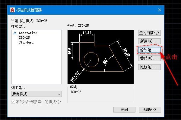 選擇你的樣式,點“修改”,打開“修改標注樣式”對話框。
