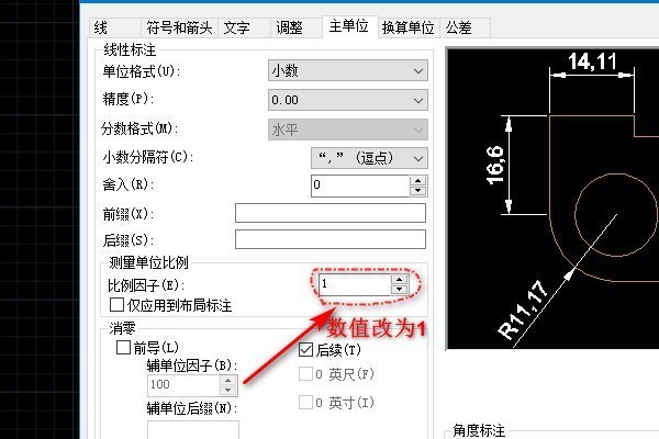 點“主單位”標簽,把“測量單位比例”的“比例因子”后面的框內數值