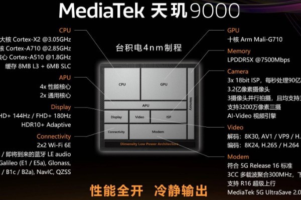 天璣9000采用臺積電4nm制程以及先進(jìn)的1+3+4三叢集旗艦架構(gòu),2.4MB超大容量緩存組合,由6MB系統(tǒng)緩存和8MB三級緩存構(gòu)成。率先支持LPDDR5X內(nèi)存,傳輸速率可達(dá)7500Mbps,適用于5G高速網(wǎng)絡(luò)下的應(yīng)用數(shù)據(jù)傳輸,是新一代旗艦手機(jī)的標(biāo)配。