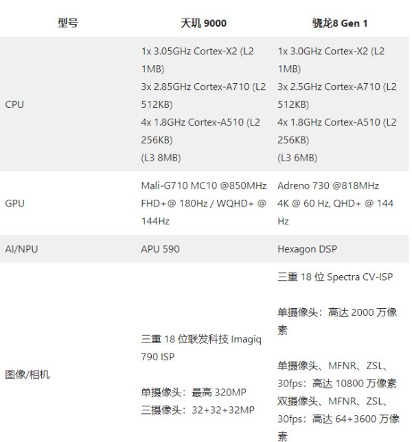 聯(lián)發(fā)科天璣 9000:8 核芯片組,于 2021 年 11 月 18 日發(fā)布,采用 4 納米工藝技術(shù)制造。它具有 3050 MHz 的 1 個(gè)內(nèi)核 Cortex-X2、2850 MHz 的 3 個(gè)內(nèi)核 Cortex-A710 和 1800 MHz 的 4 個(gè)內(nèi)核 Cortex-A510。GPU采用Mali-G710 MC10;四通道內(nèi)存LPDDR5X-7500;支持 5G 7Gbps傳輸速度。