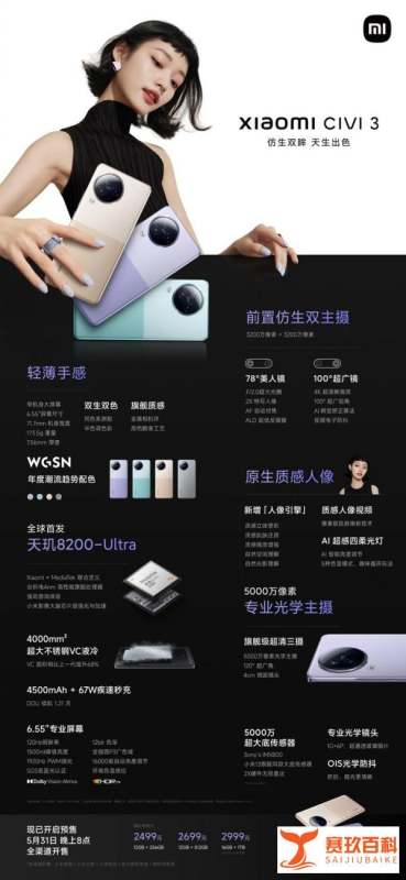 性能升級處理器更換:小米Civi系列此前常被詬病使用萬年不變的驍龍778G處理器,此次小米Civi 3終于做出改變,搭載了天璣8200 - Ultra處理器。天璣8200 - Ultra相比驍龍778G在性能上有顯著提升,能夠為用戶帶來更流暢的使用體驗,無論是日常應用的多任務處理,還是運行一些對性能有一定要求的游戲,都能更加得心應手。運行內存與存儲:運行內存方面,標準版本采用LPDDR5,16GB版本則升級為LPDDR5X,存儲規格統一為UFS3.1。更高的運行內存規格可以提升數據傳輸速度,加快應用的啟動和切換速度;而UFS3.1存儲則能帶來更快的文件讀寫速度,減少應用安裝、文件拷貝等操作的時間。散熱系統:配備了不銹鋼VC液冷散熱,能夠有效降低手機在高負載運行時的溫度,保證處理器性能的穩定發揮,避免因過熱導致降頻,從而影響用戶體驗。抗老化認證:獲得了48個月泰爾實驗室抗老化認證,這意味著手機在長時間使用后,依然能夠保持較為流暢的運行狀態,延長了手機的使用壽命。屏幕顯示小米Civi 3采用6.55英寸OLED雙曲柔性屏,這種屏幕設計不僅外觀更加時尚美觀,還能帶來更舒適的握持手感。具備120Hz刷新率和240Hz觸控采樣率,高刷新率使得屏幕畫面顯示更加流暢順滑,無論是瀏覽網頁、觀看視頻還是玩游戲,都能感受到明顯的提升;高觸控采樣率則讓手機的觸控響應更加靈敏,操作更加跟手。分辨率為2400*1080,峰值亮度達到1500nit,即使在強光環境下也能清晰顯示屏幕內容。支持12bit色深和全鏈路P3廣色域,能夠呈現出更加豐富、鮮艷、真實的色彩,為用戶帶來出色的視覺體驗。還支持1920Hz高頻PWM調光,這種調光方式可以有效降低屏幕閃爍,減少對眼睛的傷害,尤其是在低亮度環境下使用手機時,能更加呵護用戶的視力。影像系統前置攝像頭:采用前二后三的五攝方案,前置為32MP主攝 + 32MP廣角,并且配備了前置AI超感四柔光燈,新增人像引擎。雙前置攝像頭可以滿足用戶不同的自拍需求,無論是單人自拍還是多人合影都能輕松應對;AI超感四柔光燈則能在光線不足的環境下為自拍提供充足、柔和的光線,讓人像拍攝效果更加出色;人像引擎的加入進一步優化了人像拍攝的算法,能夠更好地處理膚色、膚質、背景虛化等方面,拍出更具質感的人像照片。后置攝像頭:后置50MP主攝 + 8MP廣角 + 2MP微距,主攝支持OIS光學防抖。OIS光學防抖可以有效減少拍攝時因手部抖動而產生的模糊,提高照片的清晰度和成片率,尤其是在拍攝夜景、長焦等場景時效果更為明顯。續航充電配備4500毫安電池和67W有線快充,4500毫安的電池容量能夠滿足用戶一天的正常使用需求,而67W有線快充則可以在短時間內為手機補充大量電量,減少用戶的充電等待時間。其他配置音頻方面:支持單揚聲器,相比前幾代的雙揚聲器有所閹割,在音質和立體聲效果上可能會有一定影響。系統方面:運行MIUI 14系統,MIUI系統以其豐富的功能和個性化的設置受到廣大用戶的喜愛,MIUI 14在流暢度、功能性和美觀度上都有進一步提升。外觀顏色:配有椰子灰、薄荷綠、奇遇金、玫瑰紫四種顏色,滿足了不同用戶對于手機外觀顏色的個性化需求。機身尺寸與重量:機身三圍為158.7571.77.56mm,重173.5g,機身較為輕薄,便于攜帶和握持。版本與售價:配有12 + 256GB、12 + 512GB、16 + 1TB三個版本,售價分別為2499元、2699元、2999元,用戶可以根據自己的存儲需求和預算進行選擇。