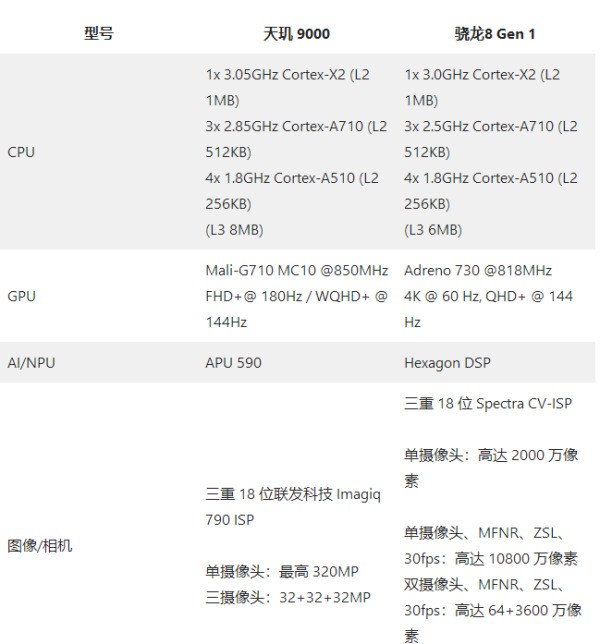 聯(lián)發(fā)科天璣 9000:8 核芯片組,于 2021 年 11 月 18 日發(fā)布,采用 4 納米工藝技術制造。它具有 3050 MHz 的 1 個內(nèi)核 Cortex-X2、2850 MHz 的 3 個內(nèi)核 Cortex-A710 和 1800 MHz 的 4 個內(nèi)核 Cortex-A510。GPU采用Mali-G710 MC10;四通道內(nèi)存LPDDR5X-7500;支持 5G 7Gbps傳輸速度。