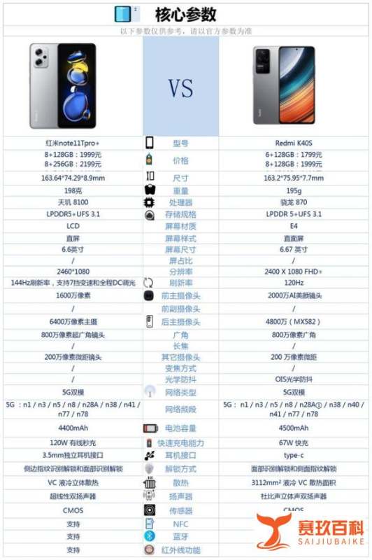 價格差異:以8+128GB版本為例,紅米K40S售價1949元,紅米note11Tpro+售價1999元,紅米K40S價格更低。機身輕薄度差異:紅米K40S厚度7.7毫米,重量195克;紅米note11Tpro+厚度8.9毫米,重量198克,紅米K40S更輕薄。