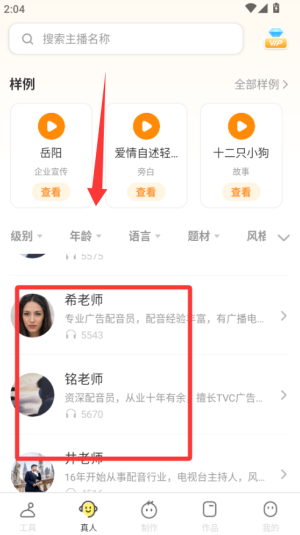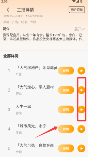 2、在主播列表里隨便點(diǎn)一個(gè)試試聽,有新聞播報(bào)、可愛小孩、磁性男聲各種類型,挑一個(gè)你喜歡的風(fēng)格,確認(rèn)后就能用這個(gè)聲音配音。